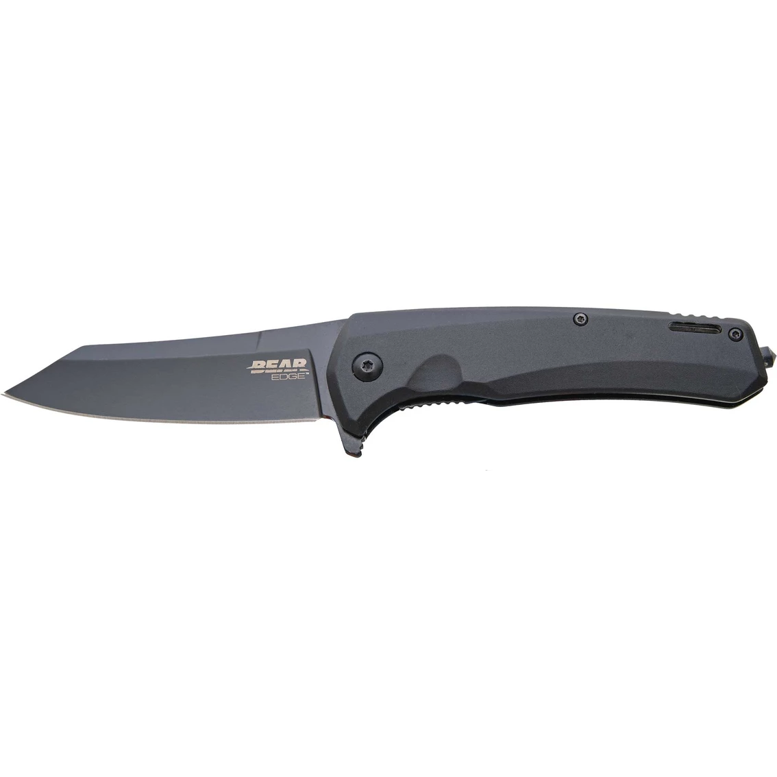 Extras: Ball Bearing Washers, Sideliner Lock, Metal Carry Pocket Clip, Bear Edge Logo on Clip, Reversible Pocket Clip, Reverse Tanto Blade and Glass Breaker