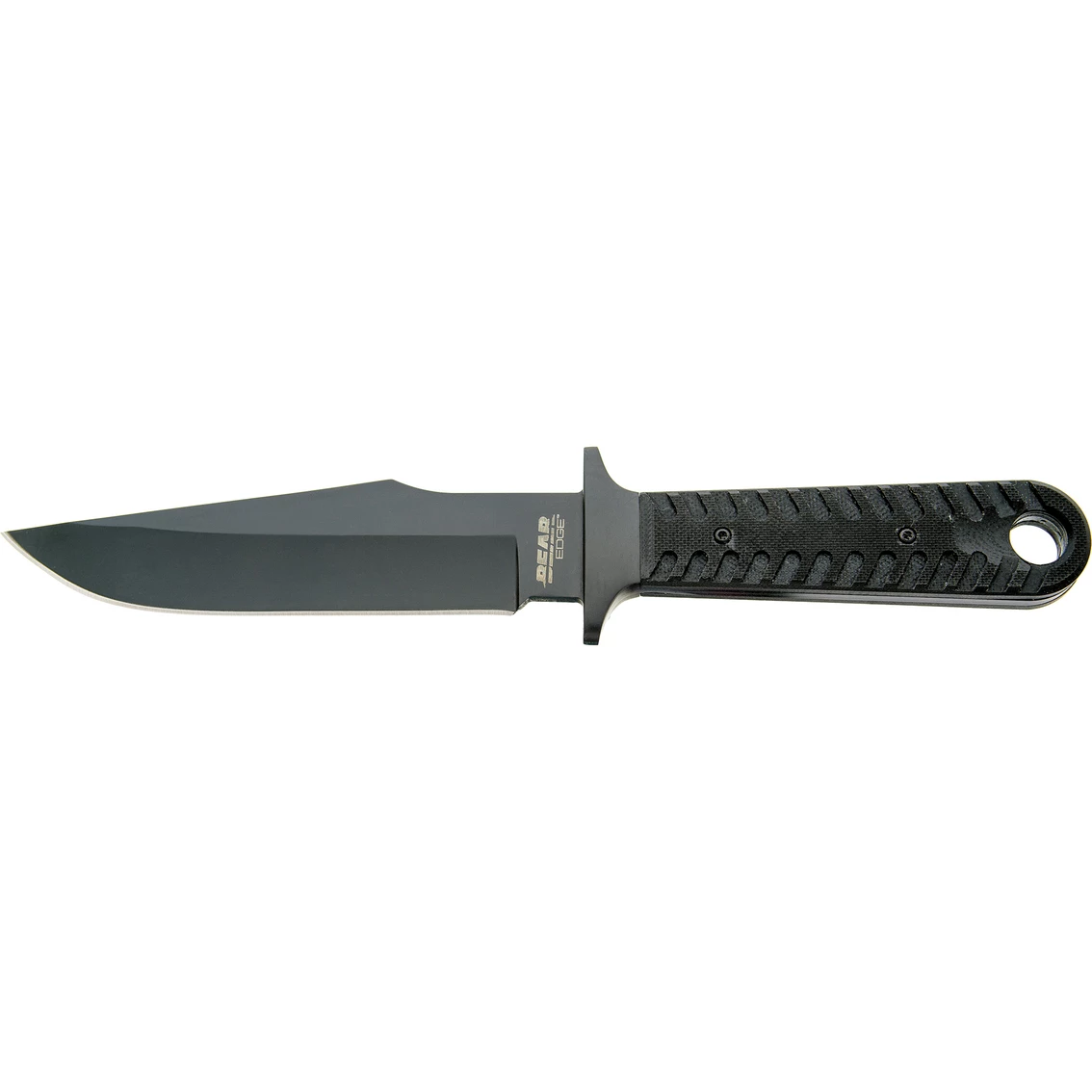 The Bear & Son Pattern 108 is a USA built 9.25 in. Black Compact Bowie knife that is part of the Bear Edge line and weighs 5.8 oz. The 5-in. hollow ground blade is made with 440 High Carbon Stainless Steel with a black coating to help prevent rust and is easy to sharpen. This fixed compact Bowie is designed with a stainless-steel guard and the Bear Edge logo is engraved on the blade. The handle is made with a rugged Black G10 style for a secure grip and comes with a ballistic sheath for belt carry. A lanyard hole is also present on the back of the handle for secure fastening and storage. Model: 71108.