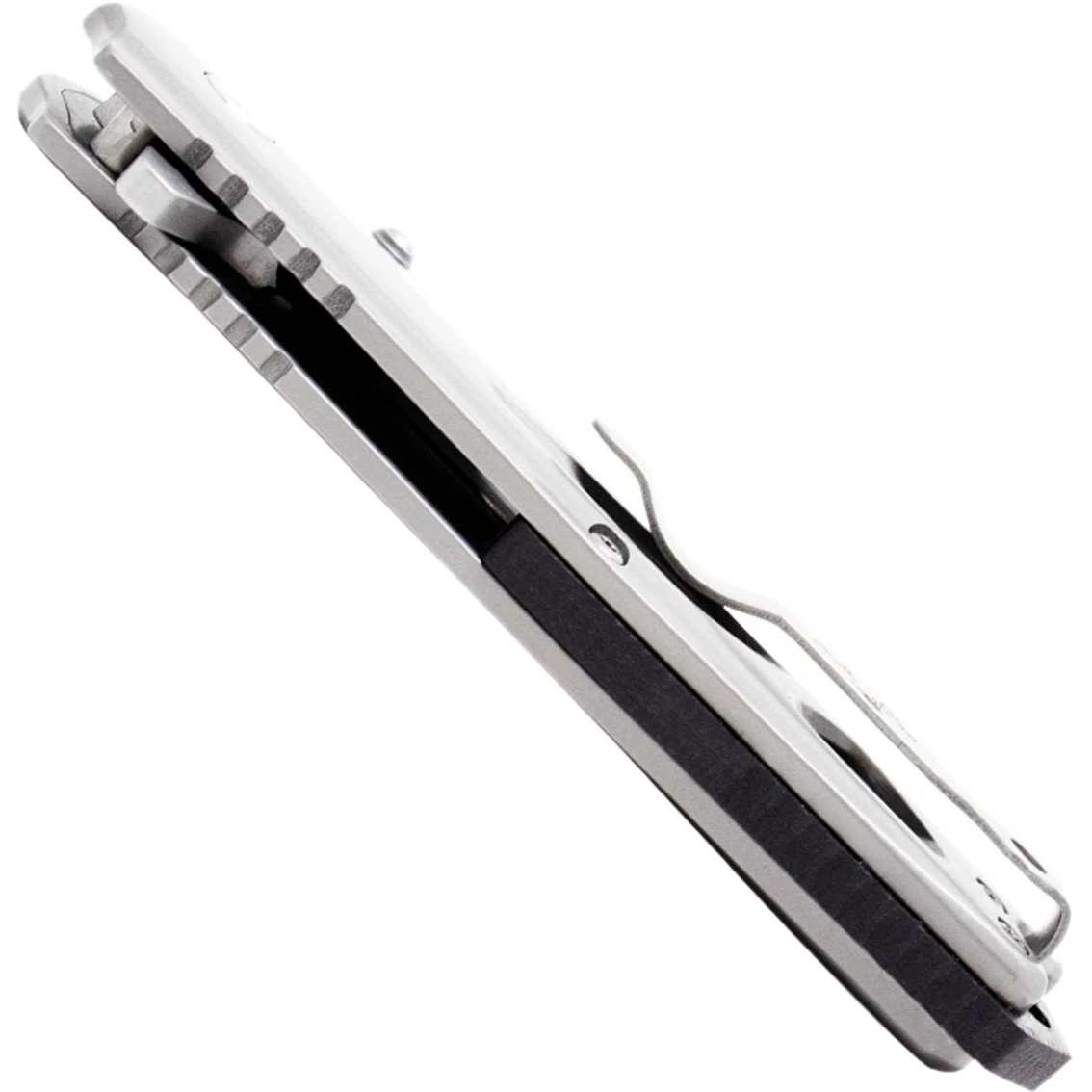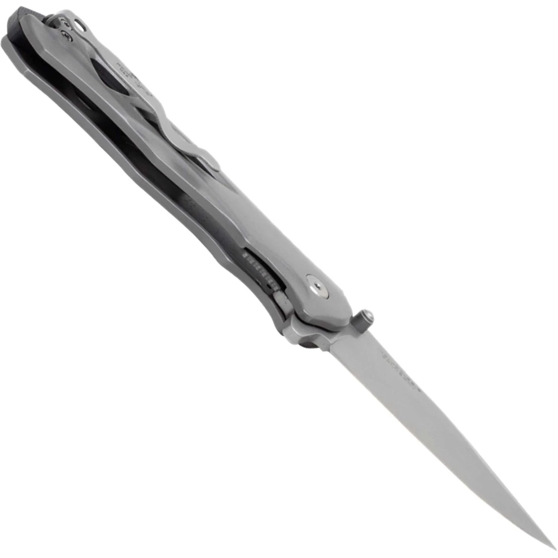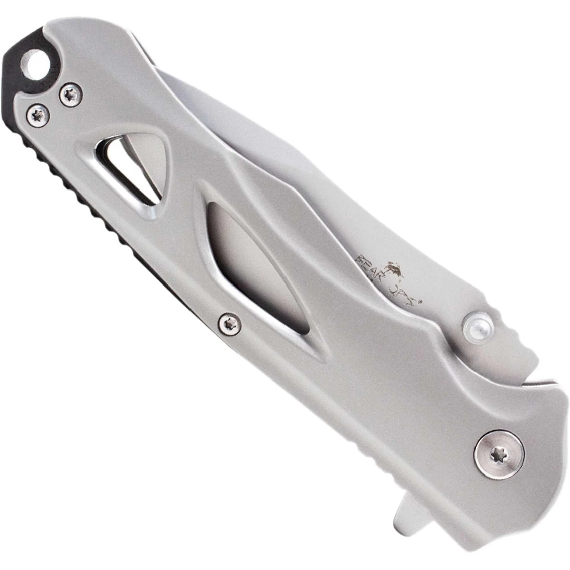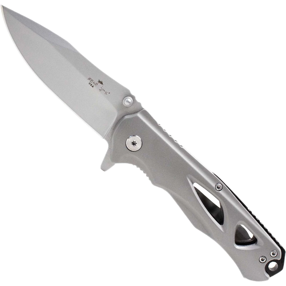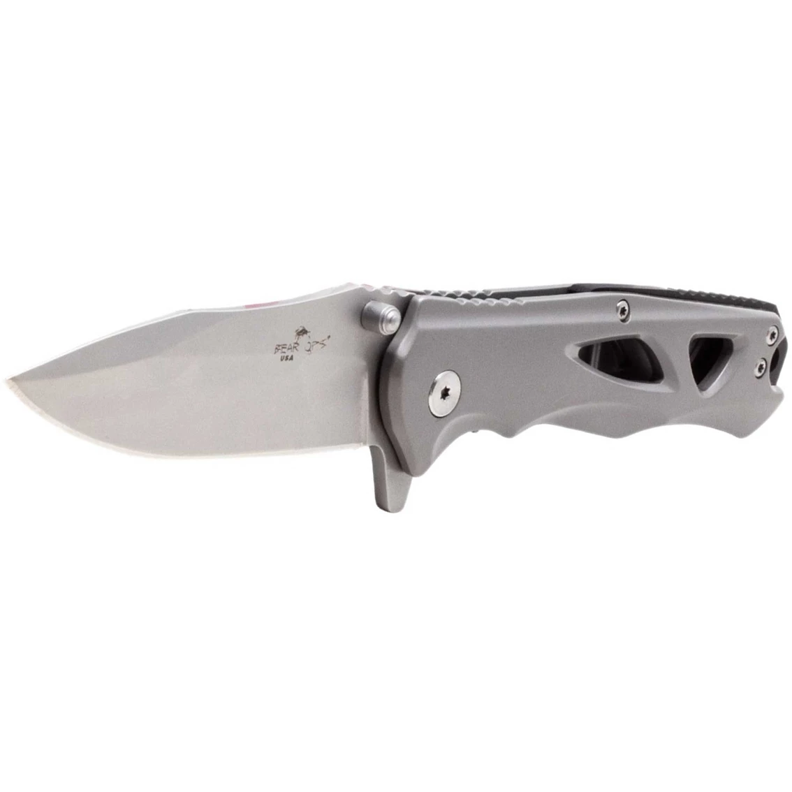 The Bear & Son Bear Ops Rancor II features a 2-7/8 in. CPM-S30V stainless steel drop point blade with a satin finish and a blade thickness of 1/8 in. It has a blade flipper and ambidextrous thumb studs. This linerlock has stainless steel handles with a tip-up pocket clip and a lanyard hole. It is 4-3/8 in. closed, 8 in. overall, and weighs 4.5 oz. Model: MC-400-SS-S.