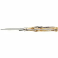 The Bear & Son Drop Point Skinner measures 7 in. overall with a 2-3/4 in. Damascus steel drop point skinner blade. It has a full tang. Genuine India Stag Bone handles with nickel silver bolster guard. Includes brown leather belt sheath. Model: 548.