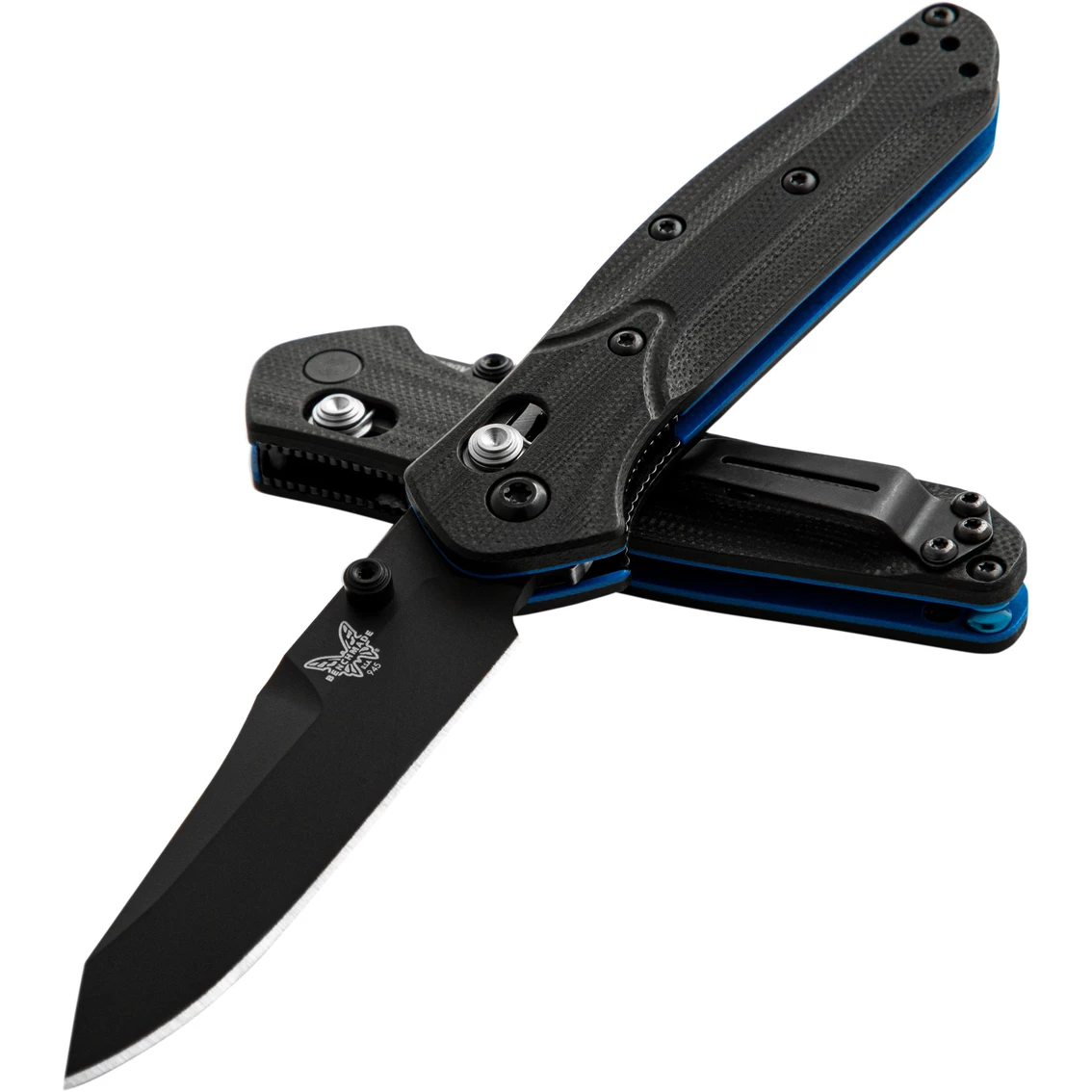 Continuing the 20th anniversary celebration for one of Benchmadeβs most iconic designs, the 940 Osborne family expands to include the long-awaited mini variation. The 945BK-1 Mini Osborne upholds the same unique styling of the 940, while scaling down the overall profile. Sporting the classic reverse tanto blade shape in CPM-S30V and a black G10 with a blue baselayer handle.