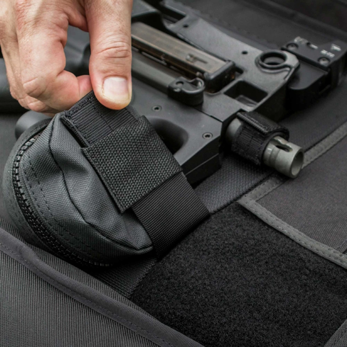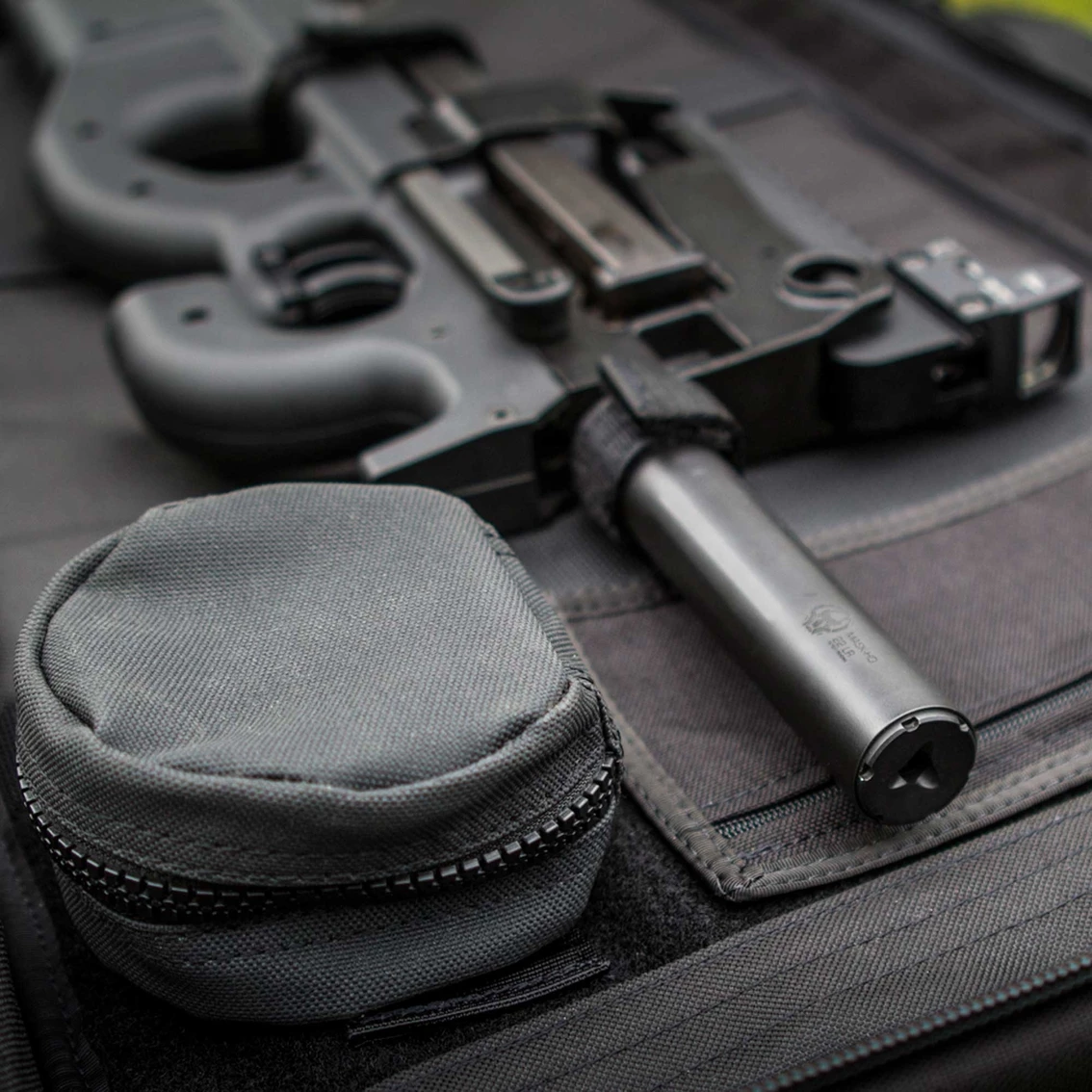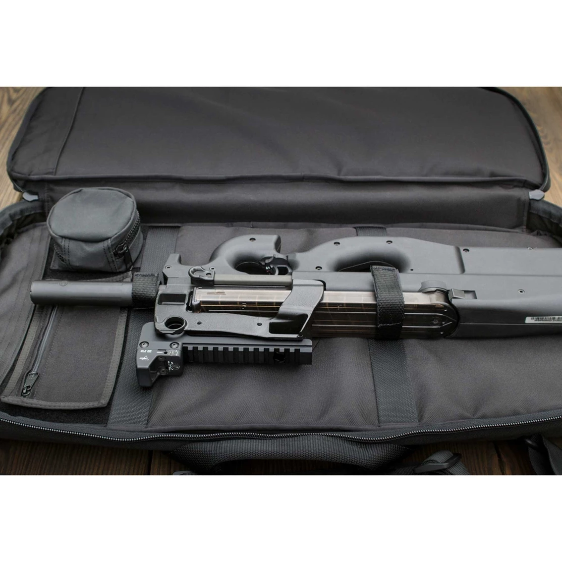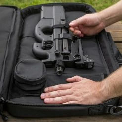 The Discreet FN Submachine Gun Case from Elite Survival fits the FN P90 and PS90. This discreet submachine gun case is constructed of 1000 denier nylon with 3/8 in. closed cell foam padding. The FN P90 and PS90 case has wrap-around handles and heavy-duty hardware with #10 heavy-duty zippers. The main compartment has plenty of room for the weapon with scope attached. It has tie-down straps for the weapon, plus a tie-down for an FN cleaning kit and a velcro patch for removable accessory pouch. (included) The submachine gun caseโs outside pocket is fully padded and has pouches for 4 magazines.