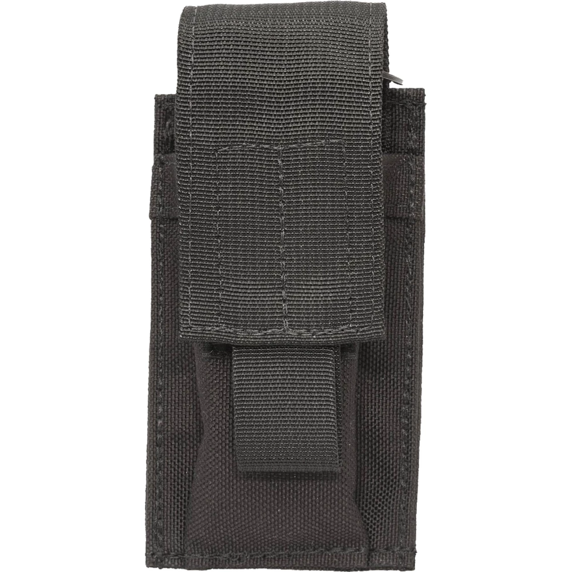 This Elite MOLLE Single Pistol Mag Pouch is constructed of 1000 denier nylon with a Hook & Loop closure. Fits 9mm/40/45 caliber magazines. Designed to fit MOLLE compatible modular equipment, including Elite vests and packs. Made in USA. Model: ME110-B.