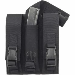 This MP5 9mm triple magazine pouch from Elite Tactical Systems is constructed of 1000 denier nylon with quick release buckle closure. The MOLLE triple mag pouch holds 3 MP5 magazines or 3 9mm 30 round stick magazines. The triple magazine holster is available in black and coyote tan. MP5 magazine pouch is designed to fit MOLLE compatible modular equipment including Elite vests and packs. 9mm ammo pouch made in the USA. Model: ME109.