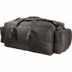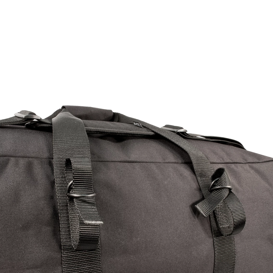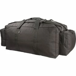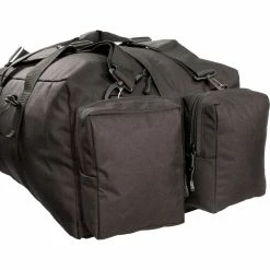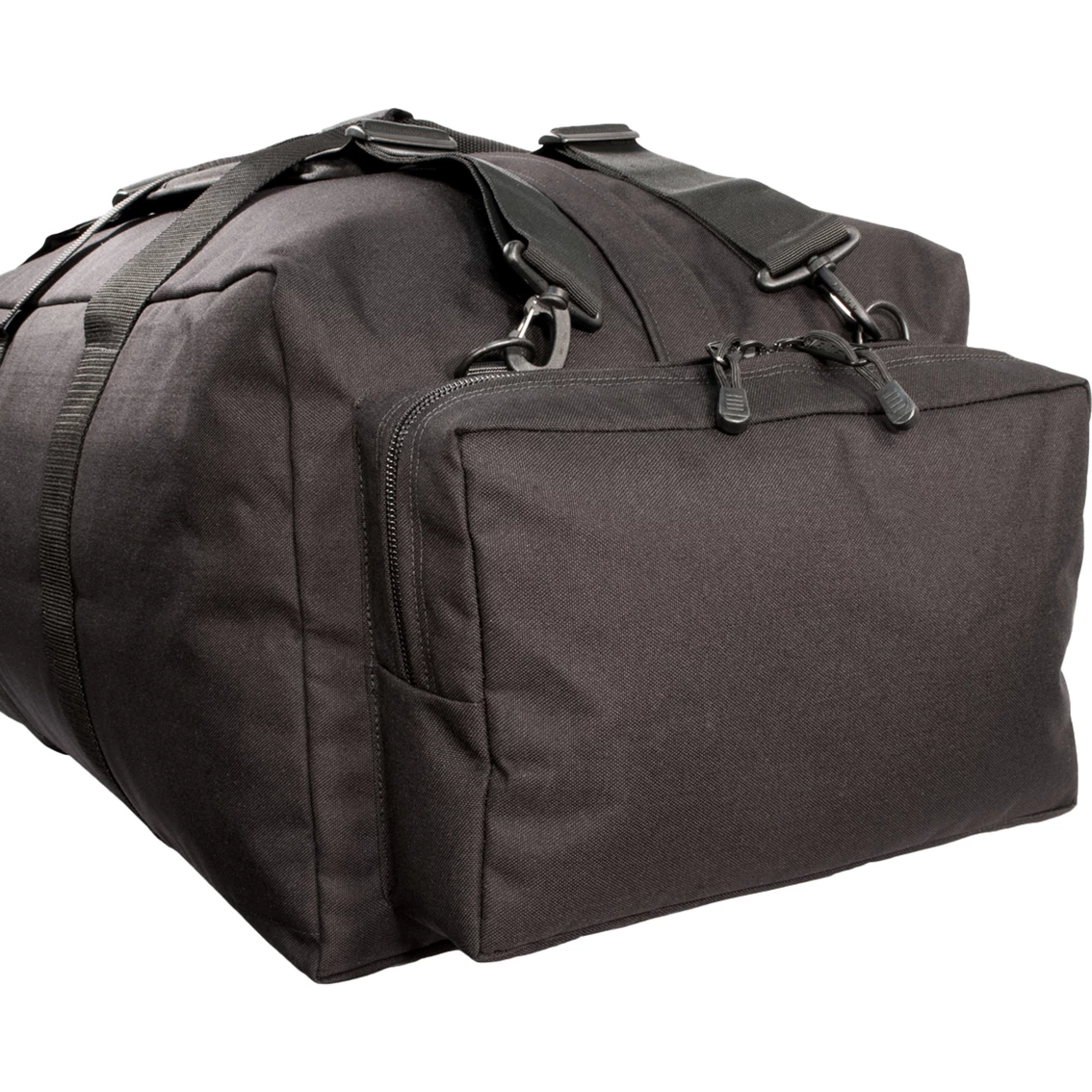 The Elite Survival International Large Gear Bag measures 34 in. x 16 in. x 13 in. It is constructed of Cordura nylon with wrap-around handles and heavy duty hardware. The travel duffle bag has a full length heavy duty zipper with a storm flap design and dual zipper pulls. This black tactical duffle bag also has two zippered pockets and a separator flap inside. Outside are three zippered compartment pockets, plus dual tie-down straps. This heavy-duty nylon duffle bag comes with two shoulder straps and is available in black only. Made in the USA. Model: IB30B.
