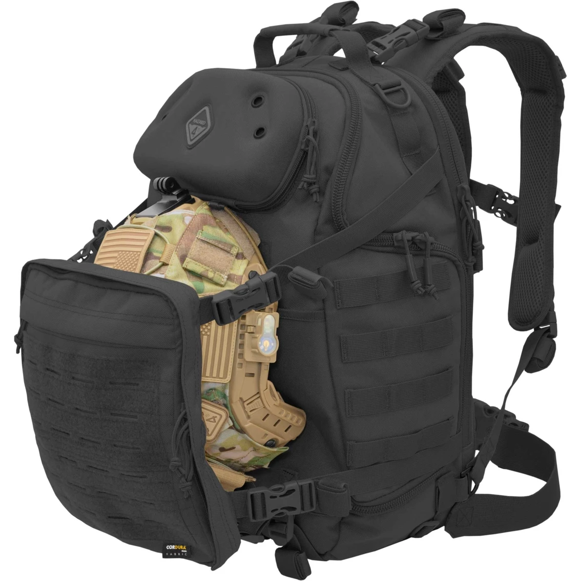 This is Hazard 4’s first daypack with an external load-carrier ‘beavertail’ for helmets, jackets, etc. The carrier can flip 180 degree down to manage long loads like rifles and the bottom hinges allow detaching and expanding. Drawbridge has a unique top, perimeter, or side sling-style zipper access choice and the load carrier has an admin area. Style: BKP-DBG-BLK.
