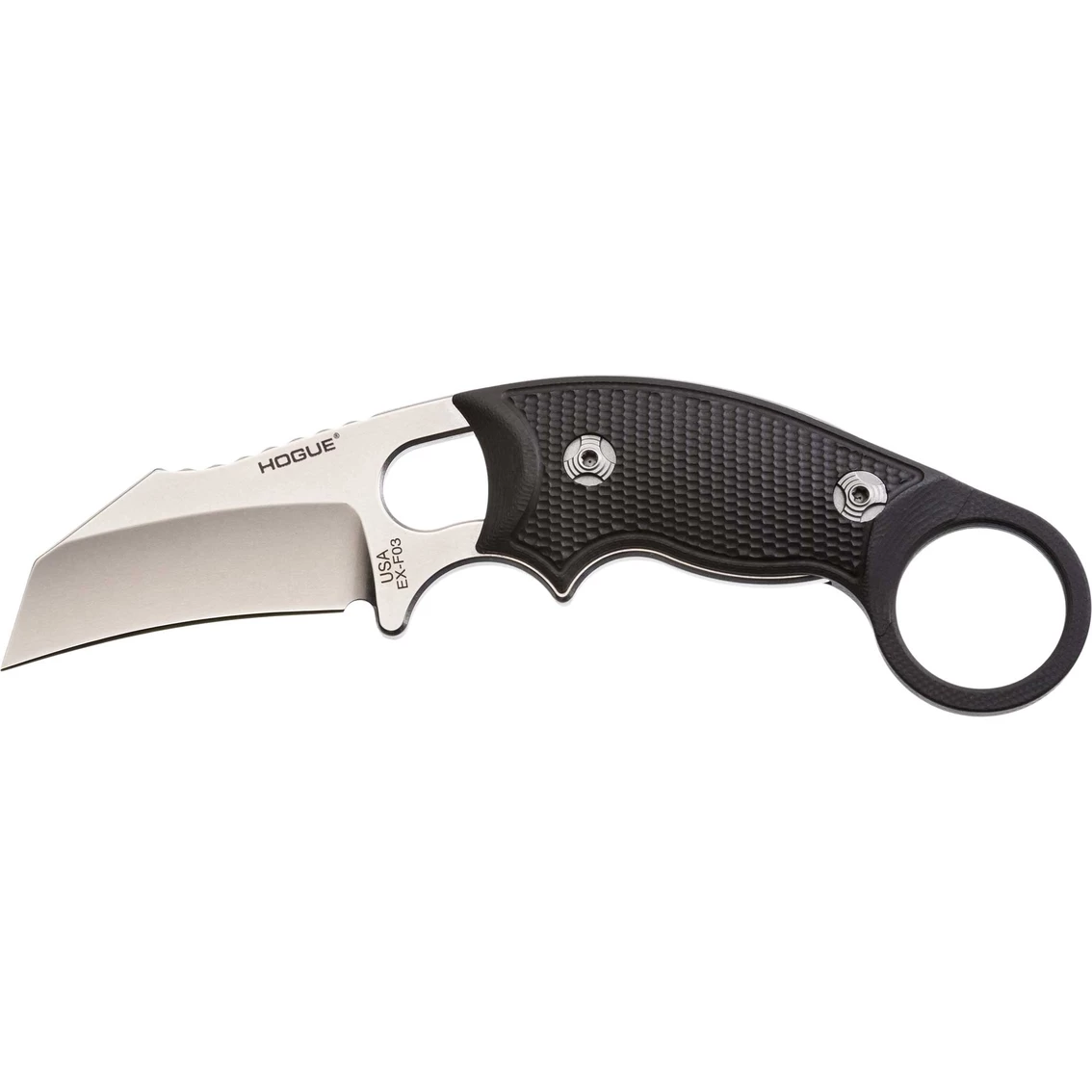 Fort Rock Tactical powered by Hogue EX-F03 Hawkbill Blade 2.25 in. G10 Knife. Fort Rock Tactical is Hogue’s exclusive government partner. You can depend on their products to perform under the most demanding environments, whether that’s in the military, the great outdoors, or industry. The EX-F03 is a discreet, compact knife that is easily carried. The finger ring aids in quick deployment and provides superior hand retention. A mini piranha texture, deep finger grooves and a textured thumb ramp offer extreme traction. Includes a nylon belt sheath along with a Boltaron neck knife sheath. Model: 35329.