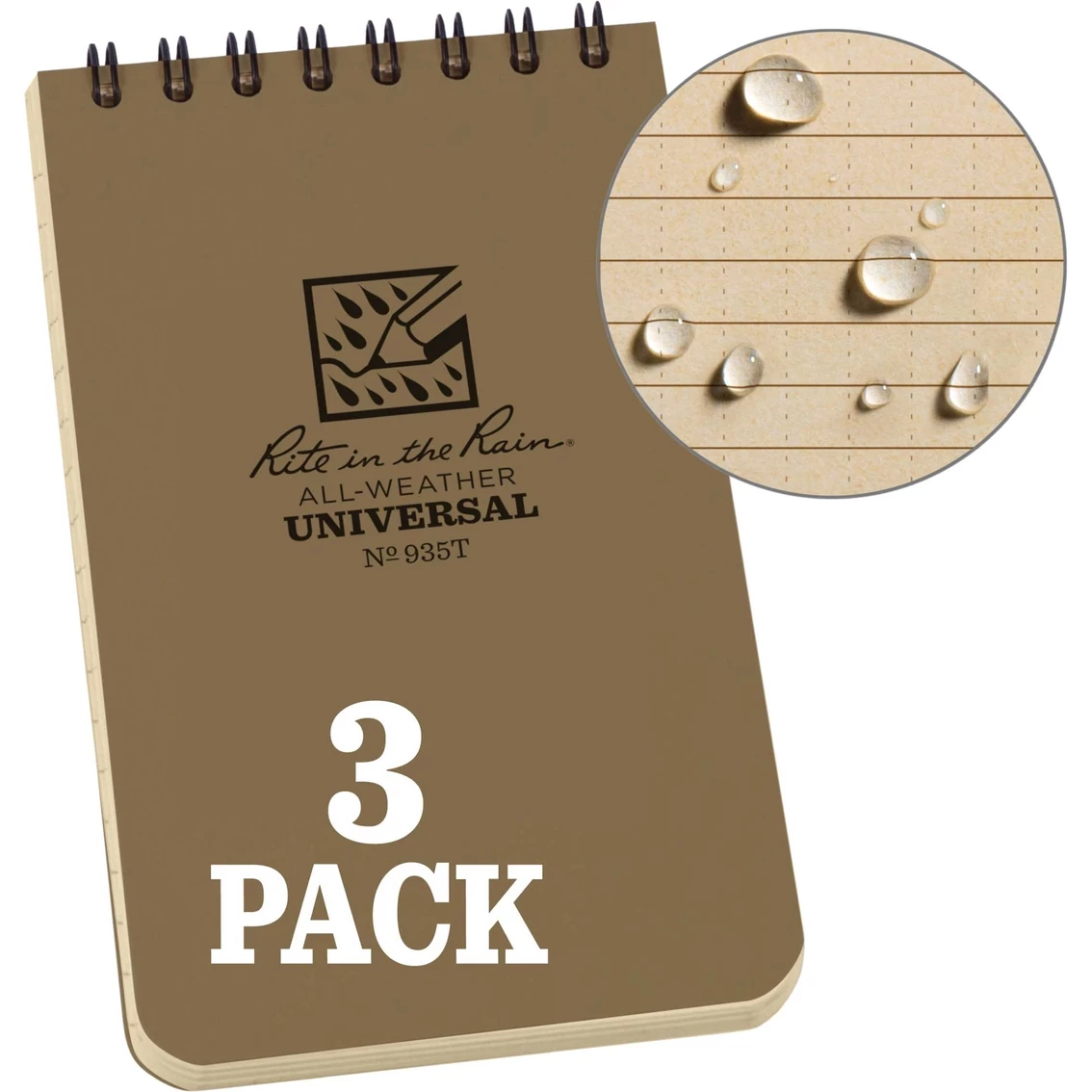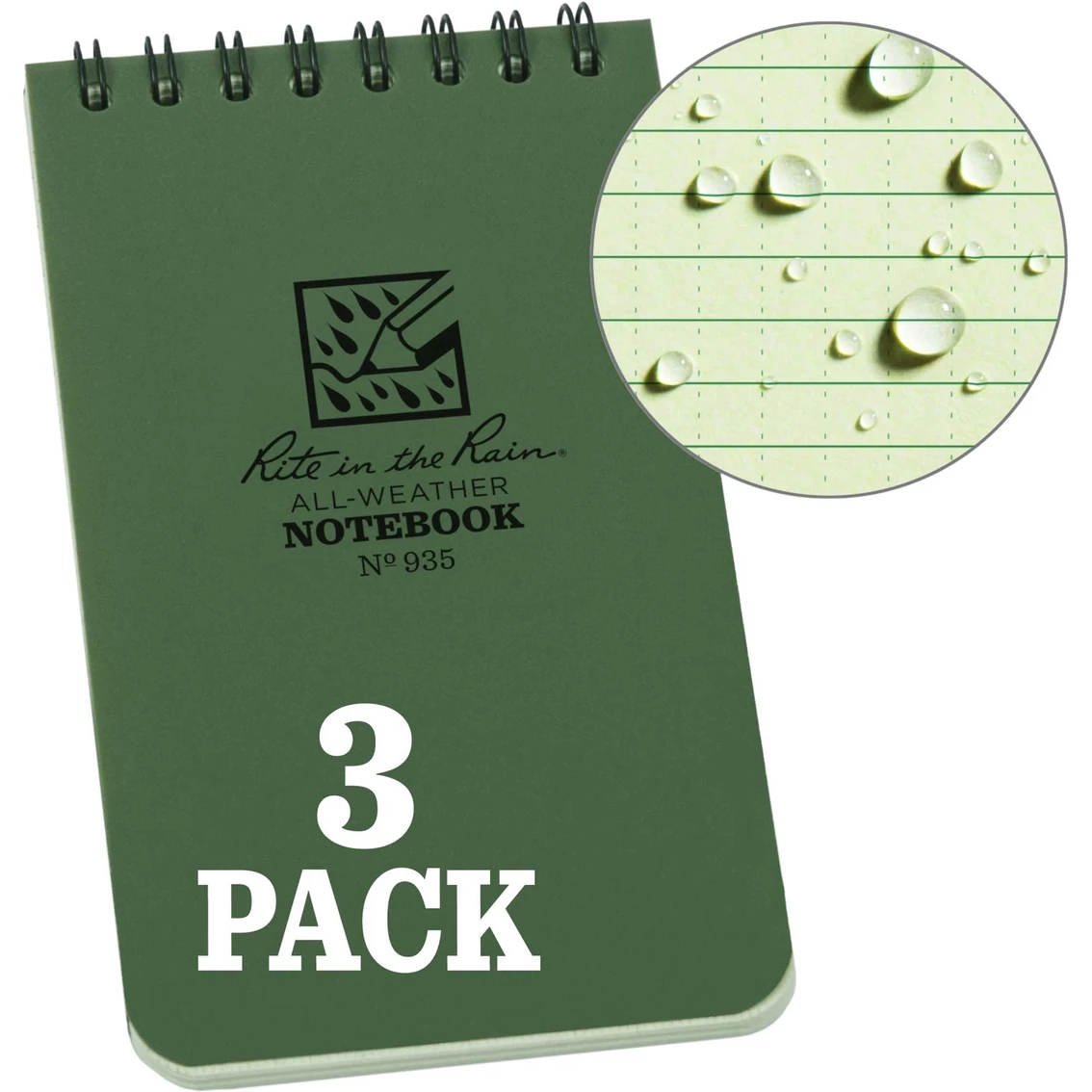The 3 x 5 in. Top Spiral Notebook by Rite in the Rain is small enough to fit comfortably in your pocket and tough enough to survive any of Mother nature’s onslaughts. This scrappy pocket notebook will survive rain, sweat, mud, snow, oil and grease. The non-glare paper is legible in bright sunlight. Impact-resistant wire-o binding won’t lose its shape. The Polydura cover defends your notes from scratches and stains. Rite in the Rain All-Weather Writing Products have been made in Tacoma Washington, USA since 1916. Recycle Rite in the Rain Paper with standard papers. Recycle the entire notebook using most curbside programs (paper, plastic and metal). Simply separate the Wire-O binding from the cover prior to recycling for easier processing. Model: 935-3.
