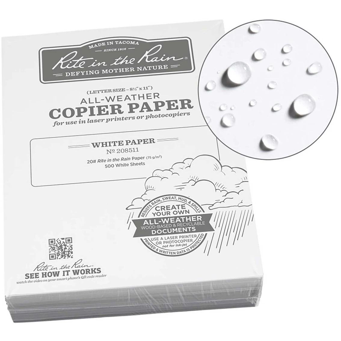 You can copy or laser print your own all-weather forms, charts, maps and worksheets on 8 1/ 2 in. x 11 in. Rite in the Rain All Weather Copier Paper. Enjoy the convenience of using your existing data sheets on a paper that can survive in any weather condition. Paper is 20# bond weight. Completely recyclable wood-based paper! Not for ink-jet printers but you can print your master copy with your inkjet, then make copies of that Master with a laser copier. Copy or laser print both sides! Size: 500 sheets.