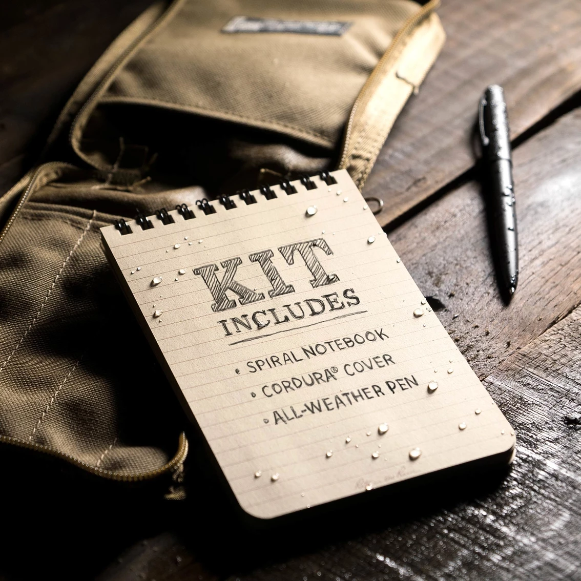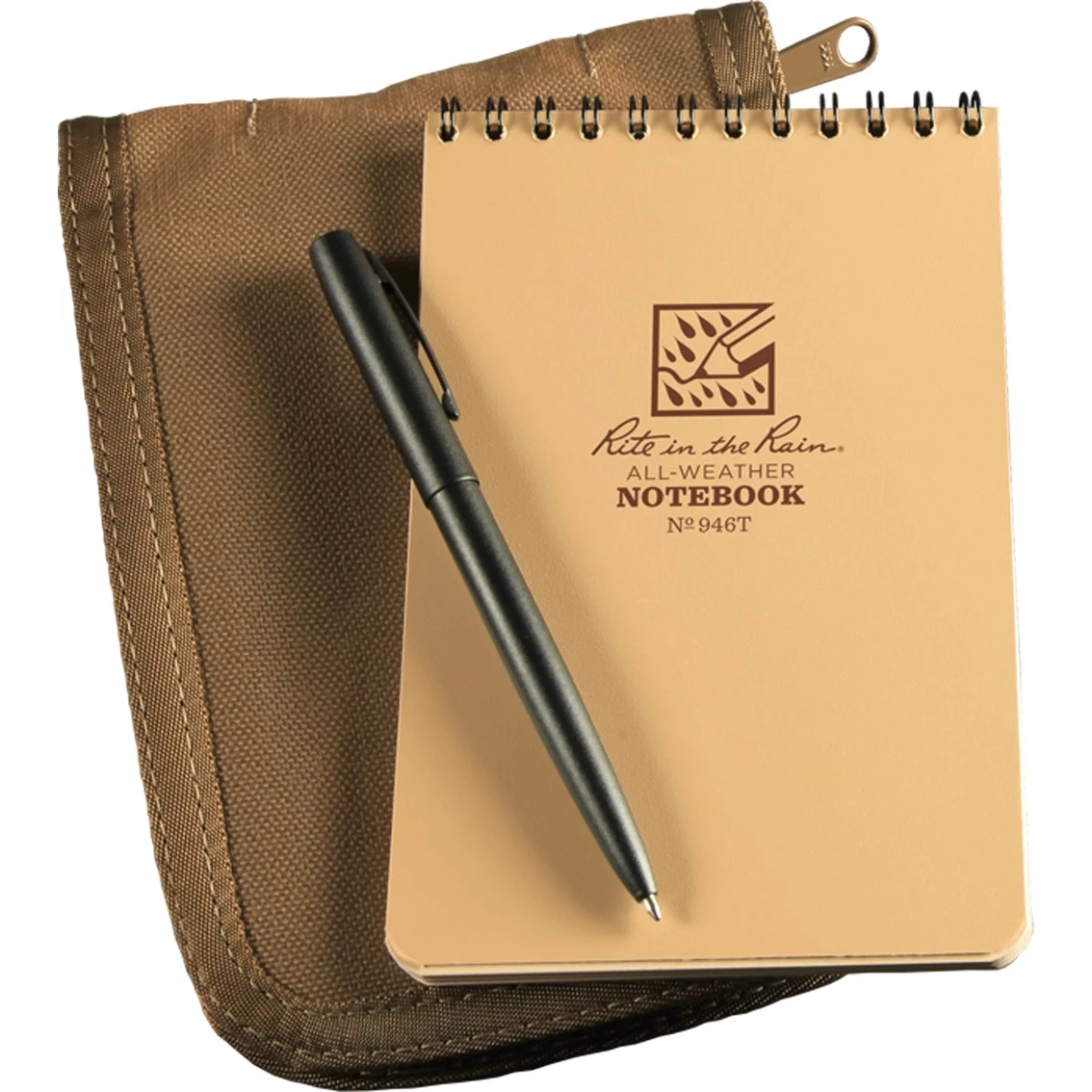 The global standard for tactical colored notebooks. Protect yourself and your notes by using the Rite in the Rain Tactical Pocket Notebooks. These top spiral notebooks have 100 Universal pages (50 sheets) in Tan. With the Universal Pattern you can use this text for notes and scaled drawings. Useful reference material is also printed on the back and inside covers. Model: 946TKIT.