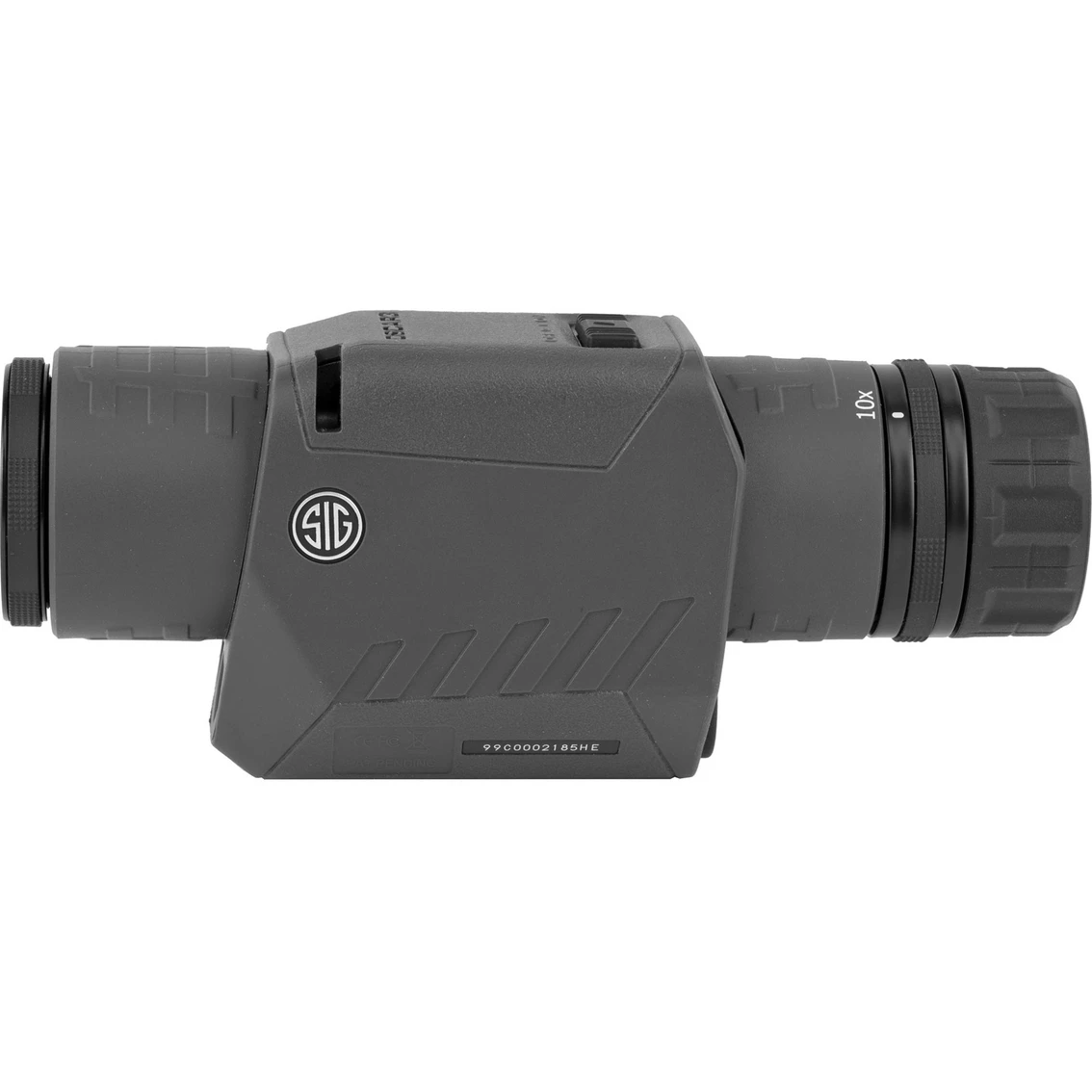 The OSCAR3 10-20x30mm is an industry first innovative mini spotting scope featuring electronic image-stabilization, putting rock-solid spotting scope magnification in the palm of your hand, no tripod required. Due to the OSCAR3 size and ranging capability, it is ideal for backpacking, spot/stalk and tree stand archery, or long range rifle hunting in open country or mountains as well as concealed viewing situations for LE or Military use. Our SOS (SIG Optic Stabilizer) system allows for quick and easy target identification by stabilizing the image and virtually eliminating a shaky image for all users. The low dispersion, fully multi-coated glass with BAK4 prism provides you with the maximum in color clarity and image brightness creating crisp resolution and image contrast. Offers a multi-position twist-up eyecup that provides a generous eye relief for all users. Dependable waterproof (IPX-4 rated) and fog-proof performance. One-handed power selector wheel offers ease of operation while holding a rifle or bow. Model: SGSOV31001.