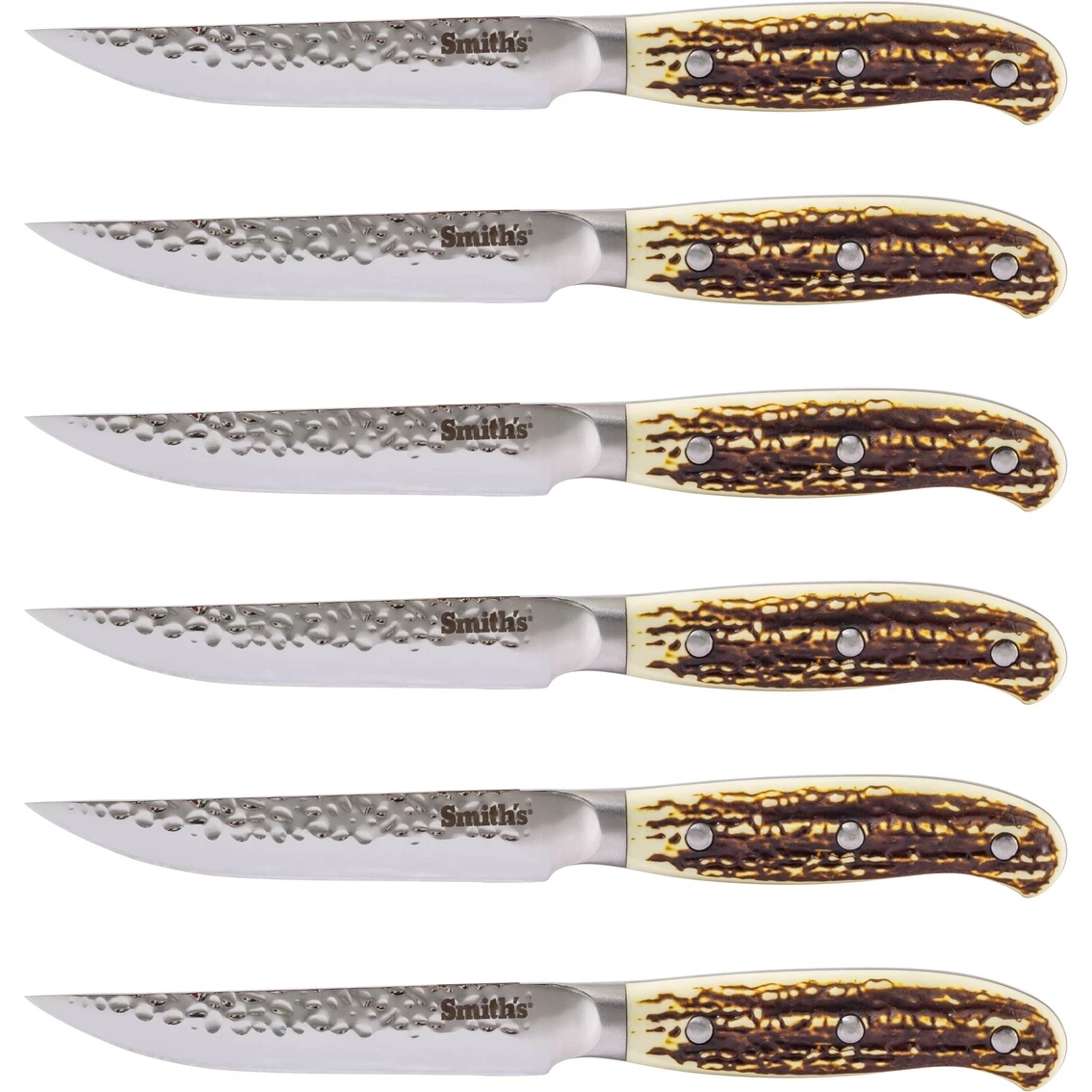 Cabin & Lodge Kitchen Knives from Smith’s feature 420 stainless steel blades with a custom hammered finish and handsome stag handles. These knife sets will satisfy any home-based chef and will provide many years of trouble-free use.