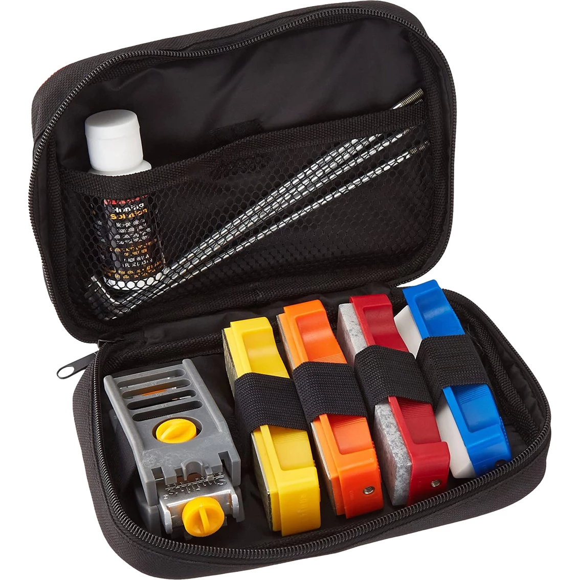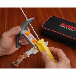 Smith’s Diamond/Arkansas Stones Precision Knife Sharpening System offers an easy way to sharpen all types of knives . . . INCLUDING SERRATED. The fabric storage pouch makes this kit portable and easy to store, and the 1-inch wide stones makes sharpening safe, fast, and easy. The kit comes with a Coarse Diamond Stone, Fine Diamond Stone, Fine Arkansas Stone, Medium Triangular shaped Ceramic Stone for serrated edges only, and Premium Honing Solution.