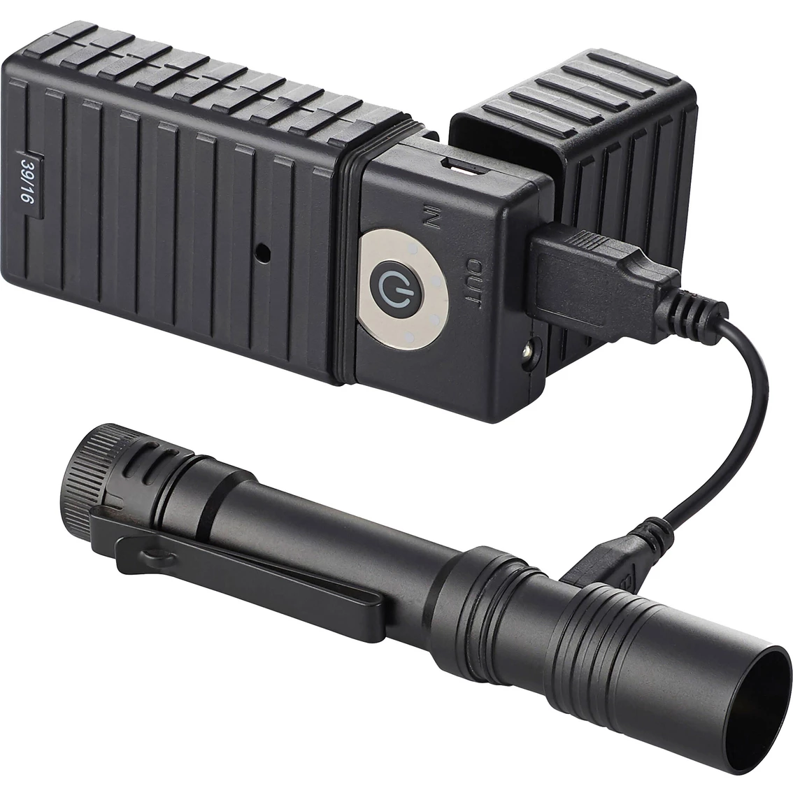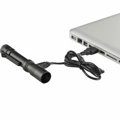 USB Rechargeable, Super Bright Small LED Flashlight. Compact, this personal light, which fits in the palm of your hand or comfortably in your pocket, provides unparalleled performance for its size. High and low modes (double bump the tail switch to change modes): High: 500 lumens; 90m beam; runs 2 hours. Low: 50 lumens; 30m beam; runs 8 hours. Lithium ion battery charges in-product in 4 hours. Durable, anodized machined aluminum construction; scratch-resistant polycarbonate lens. Metal sleeve protects charge port; slide sleeve forward to reveal charge port with charge indicator: Red – charging. Green – fully charged. Removable pocket clip also clips onto brim of hat for hands free use. IPX4 water-resistant; 1m impact resistance tested. Includes USB cord.