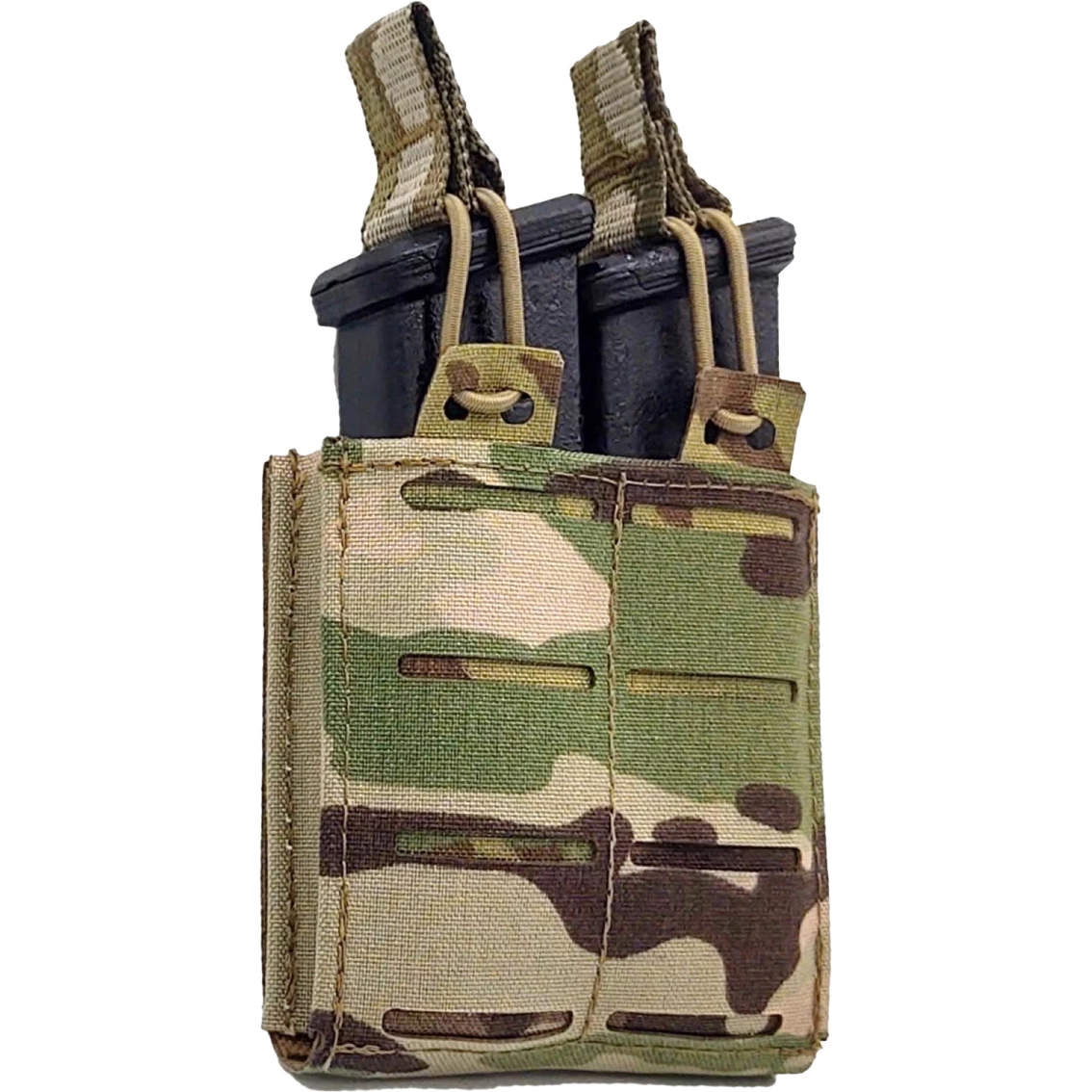 Tac Shield RZR MOLLE Double Pistol Speed Load Pouch is the latest in Gen III MOLLE using lazer cutting technology and durable laminate for individual load-bearing equipment. 50% lighter than legacy MOLLE pouches. Slimmer silhouette mass helps suppress profile signature, reduces βjocked upβ bulkiness, and limits snagging with its smooth outer construction. Service pistol M9/M17-18 sized magazines are retained with top quality elastic cords and convenient pull tabs. RZR MOLLE family is designed to function interactively as a holistic WARRIOR fighting system and is still 100% compatible with your current MOLLE/PALβs equipment. Model: T3667OCP.