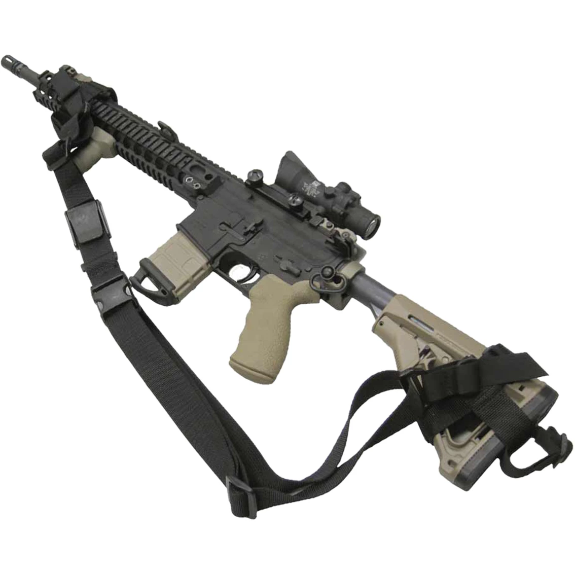 This combat sling from Tac Shield features a 3-point universal system with an ERB release buckle that allows for quick removal from the body. The Universal System works with the various issued M16 and AR15 configurations. The 1 1/2 in. Mil-Spec webbing ensures strength and additional comfort in the field. The fast-adjust cam lock allows for easy cross-shoulder transitions. Simply flip the cam lock open and quickly extend the sling to reposition your weapon. Model: T6000BK.
